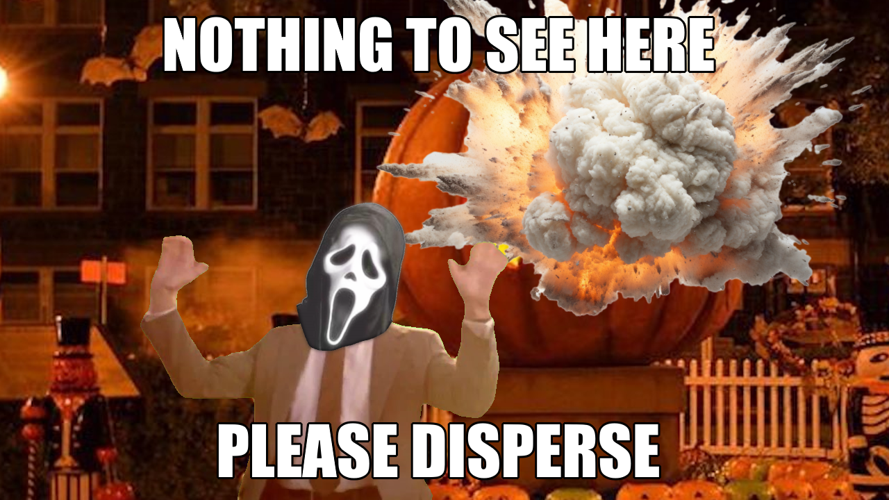 Suddenly, we're all standing in the Town Square, all our the backs turn to the pumpkin.