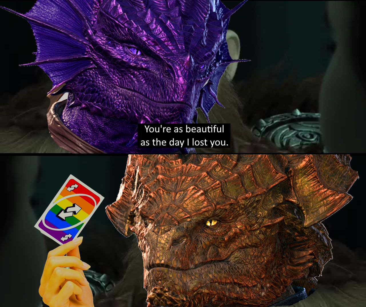 They turn around to finally face us, where we can notice an aged gold Dragonborn, in their 60s. Then they welcome us.